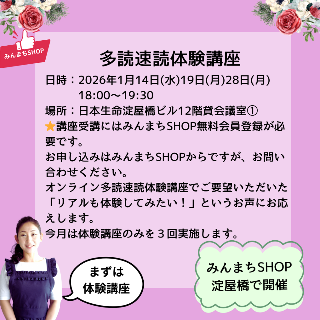 以前よりみんまちショップで開催している多読速読講座!