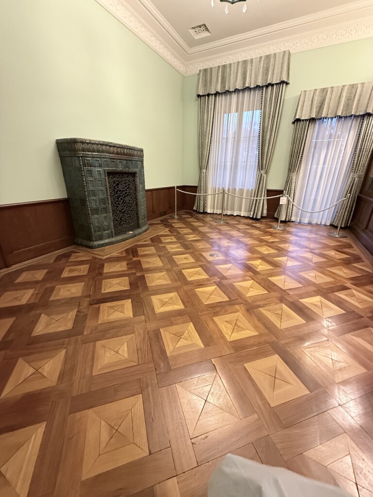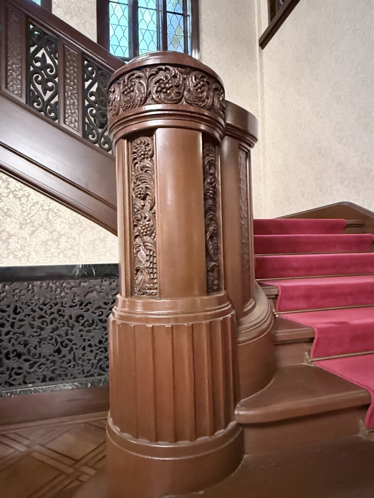 では入館。階段と奥に暖炉が見えます。