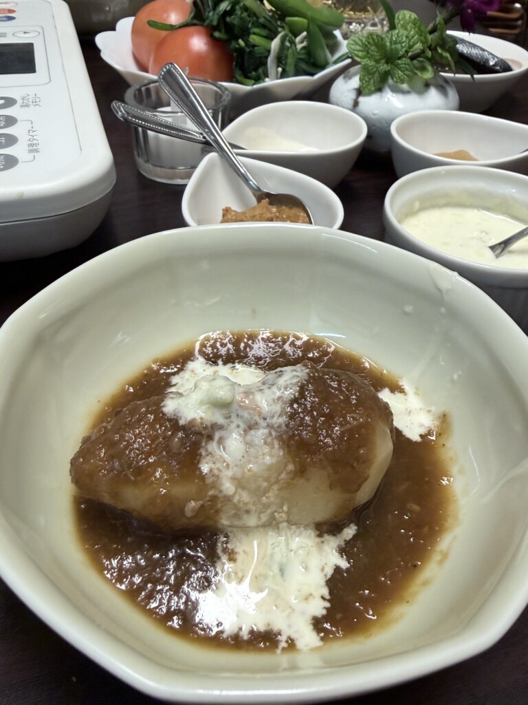 おでんの蒟蒻のミートソース焼き。